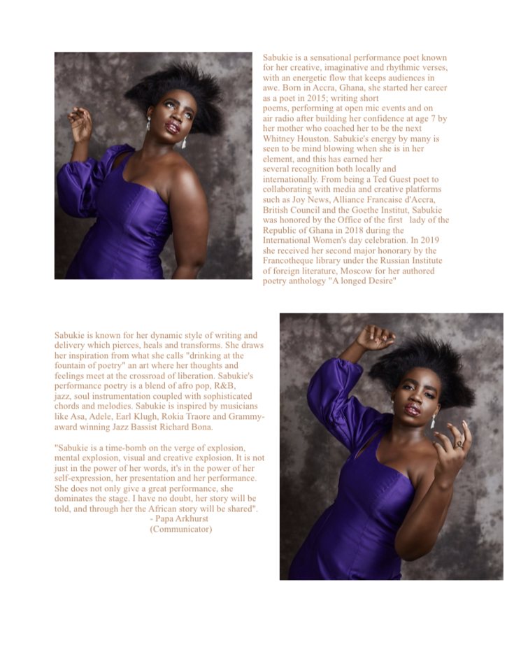 Sabukie is a sensational performance poet known for her creative, imaginative and rhythmic verses, with an energetic flow that keeps audiences in awe. Born in Accra, Ghana, she started her career as a poet in 2015; writing short poems, performing at open mic events and on air radio after building her confidence at age 7 by her mother who coached her to be the next Whitney Houston. Sabukie’s energy by many is seen to be mind blowing when she is in her element, and this has earned her several recognition both locally and internationally. From being a Ted Guest poet to collaborating with media and creative platforms such as Joy News, Alliance Francaise d’Accra, British Council and the Goethe Institut, Sabukie was honored by the Office of the first lady of the Republic of Ghana in 2018 during the International Women’s day celebration. In 2019 she received her second major honorary by the Francotheque library under the Russian Institute of foreign literature, Moscow for her authored poetry anthology “A longed Desire”