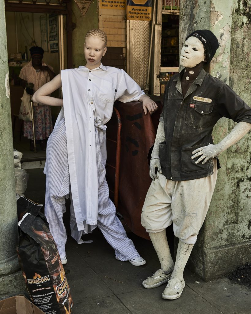 I would have to say the Image with the Albino girl and the guy with the white face paint. 2 parts to the story. Firstly, I was born and grew up in Umtata in the then Transkei, now the Eastern Cape, which is ancestrally Xhosa. When I was very small, my friends were black kids from the Pondolands who went through ritual initiations into manhood. They would have their faces painted white, called the Umkhwetha and go through ritual circumcisions to become a man. I discovered these guys busking at a traffic light in Durban with his face painted white, and it took me back to seeing the Umkhwetha passing through my rural home town of Umtata as a child. I knew I needed to use him in a shoot. Although not in the traditional way, it was just as inspiration for the story in my memory.