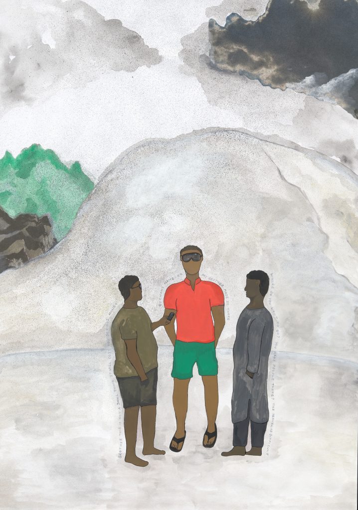 The Salt Mine series is an African classic by Karimah Ashadu. A work that, maybe wasn’t too, or was not supposed to be noticed, but looks to be one of the best pieces of art to emerge from the artist’s studio. The use of Gouache and cut newspapers to visualise a short story about the uncertainty and effects of migration is exemplary, the voice is also very fresh and original. Karimah’s Salt Mine series is set in Dakar with a strong theme of independence, labour, and patriarchy, featuring a young man about to embark on a journey overseas in the wake of his older brother. The painting follows through every one the main character approached to discuss his plans to migrate, starting with his mother, who expressed the agony of losing her children, and then his father, friends, as well as other background characters that were weaved into this series to properly illustrate the general idea by the artist, fusing cut out, as well as other everyday life items like radios and television from discarded newspapers, giving evidence to how Karimah Ashadu’s work cuts across various mediums of storytelling: film, sound, sculptures, and painting. But they are also fastened by some of her most prominent sentiments, including her dedication to wandering into the mundane, as well as her undying fascination with Lagos, Nigeria. This healthy fascination of Nigeria by Karimah is also the catalyst for her latest film production, Machine Boys.