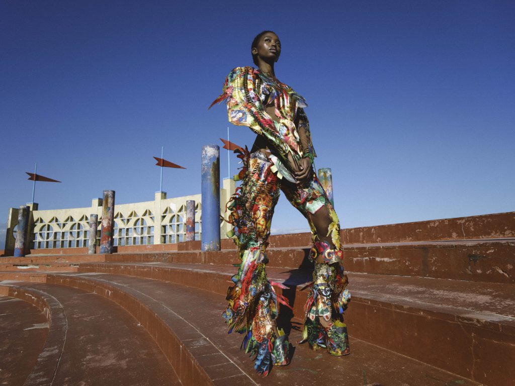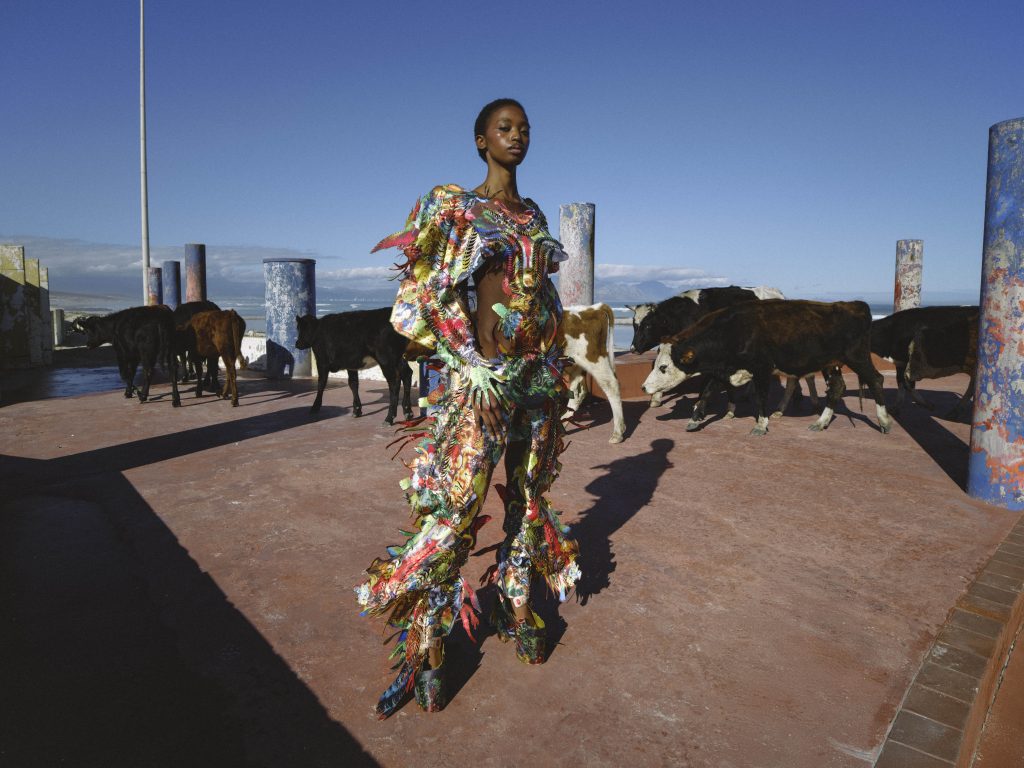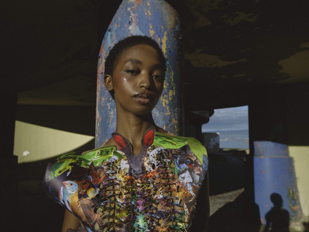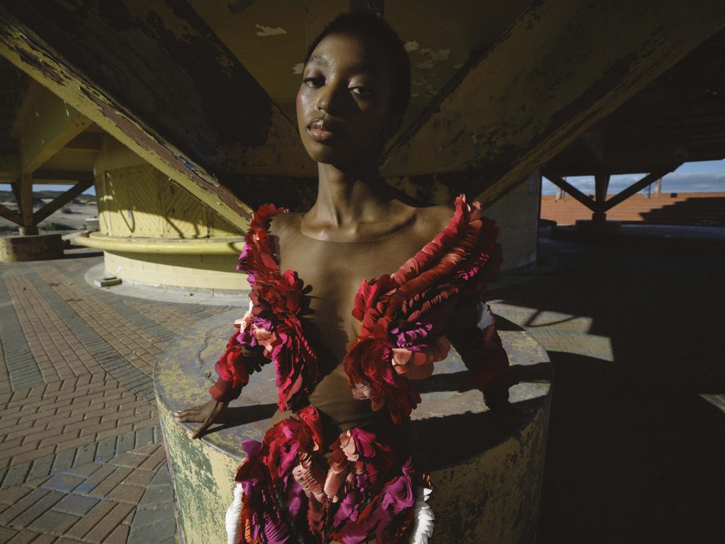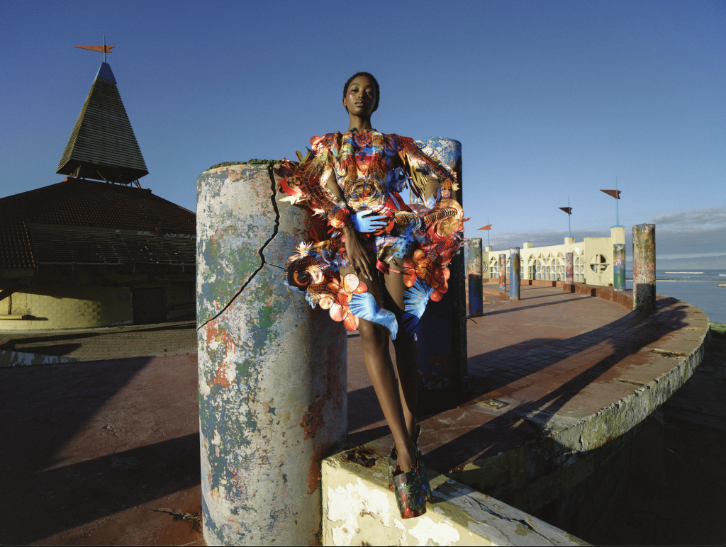 There’s something incredibly unique, unpredictable and thrilling about multidisciplinary collaborations. This shoot, captured in a long-forgotten former resort on the outskirts of Cape Town, has quietly become one of my favourite creative moments in recent memory. It all began with a shared desire: to capture my designs in a way that felt raw, honest, and deeply connected to South African culture. Not reinvented or polished to fit a narrative – just seen and celebrated as they are. From the very beginning, we all decided to let go of control & lean into trust. Jacques Weyers came with a clear vision and his eye for light and movement, crafting a world of shadow & texture around the garments. I brought my designs, untouched and true to the vision they were born from. Sam Scarborough translated the architecture, colour, and mood of the space into makeup that felt alive and effortless. And Nnomvelo Mabaso carried the story with a grace and energy that can’t be staged. None of us tried to lead or define the other. We simply listened, created, and built on each other’s rhythm. And that, to me, is where real fashion magic happens – in that space between trust & surrender, where individuality meets collaboration & something entirely new is born.