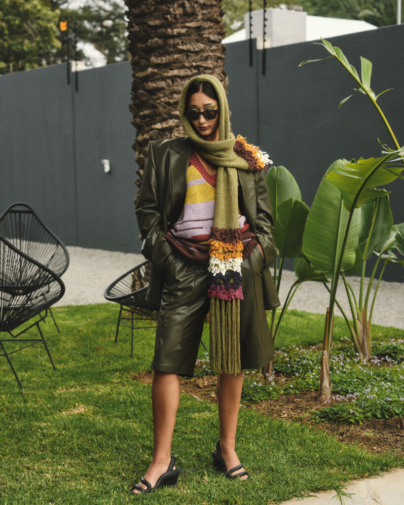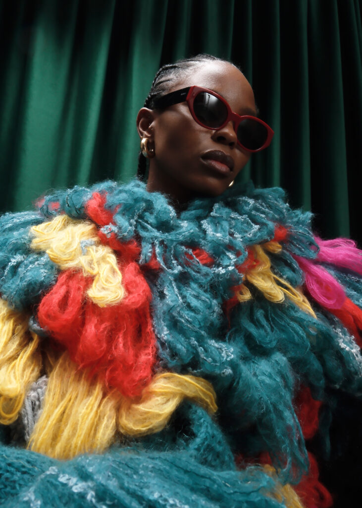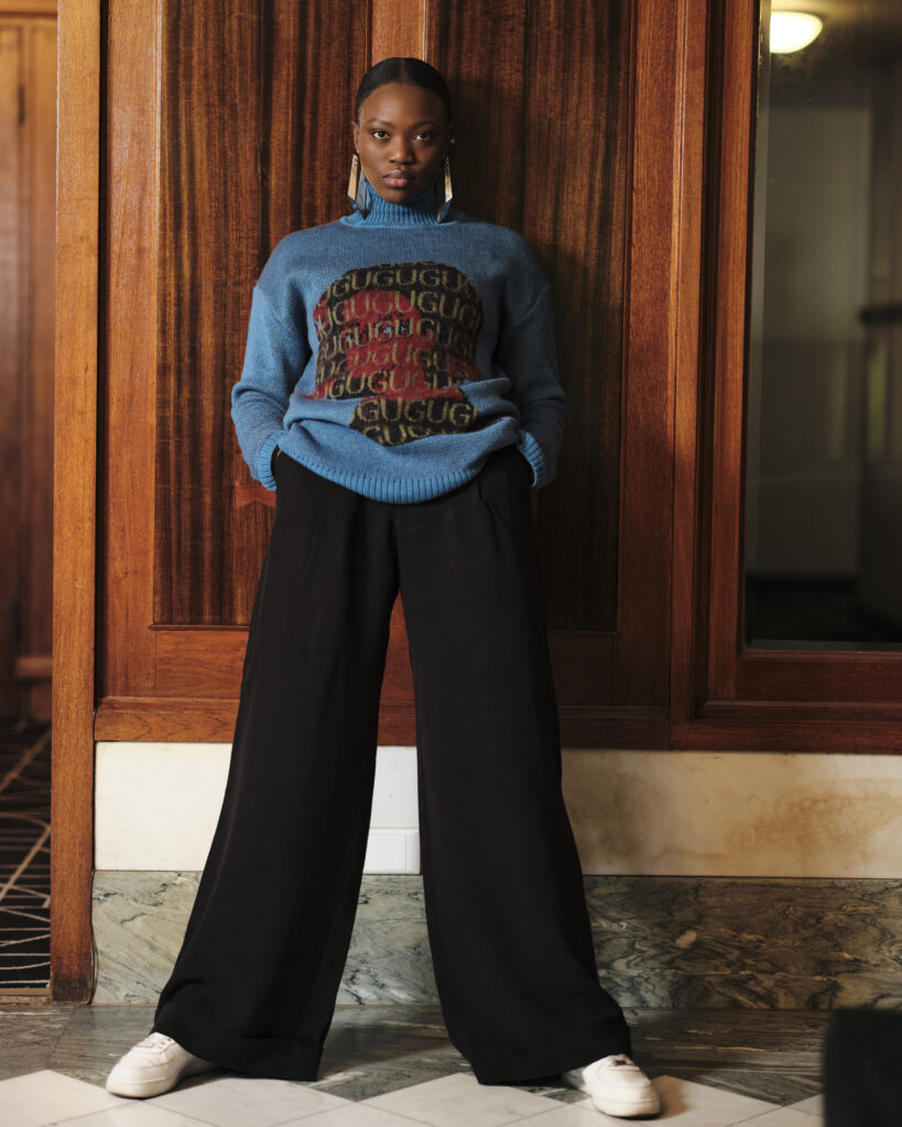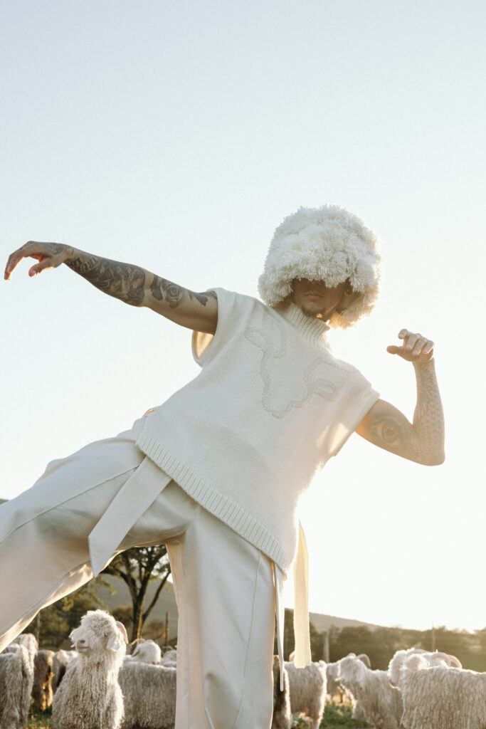 This commitment is not aesthetic branding. It is architectural. The garments are built with weight and deliberation. Knitwear forms the nucleus of the label, often oversized, sculptural, and gender fluid, carrying both comfort and authority. The silhouettes resist neat categorisation, merging 90s street references with contemporary minimalism. There is nostalgia here, but it is not sentimental. It is reworked, recontextualised, and sharpened. What makes GUGUBYGUGU particularly resonant is its refusal to flatten African design into a motif. The work does not rely on obvious signifiers. Instead, its Afrimodern sensibility emerges through texture, proportion, and narrative framing. Identity is approached as something layered and evolving, rather than fixed. Presented internationally and recognised at Africa Fashion Up in Paris with the Young Designer Award, the collection signalled that Peteni’s voice is not regional, but global. Yet global in this context does not mean placeless. GUGUBYGUGU’s ongoing conversation with mohair, and the Angora goat from which it is sourced, situates luxury within geography. South Africa is not a backdrop to the story. It is the source code. Through campaigns that foreground fibre as protagonist, the brand reframes material as narrative. The cloth remembers where it comes from.